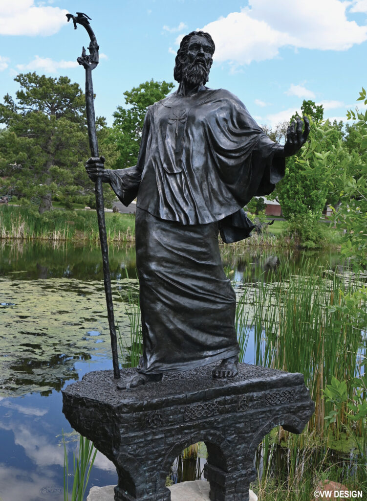 The St. Patrick sculpture is a collaboration between artists Elijah Nugent and his mentor Jack Kreutzer. It was originally commissioned for Marian University in Indianapolis by their patron Bill Witchger. This is Jack’s fourth permanent installation in Benson Sculpture Garden and Elijah’s first.